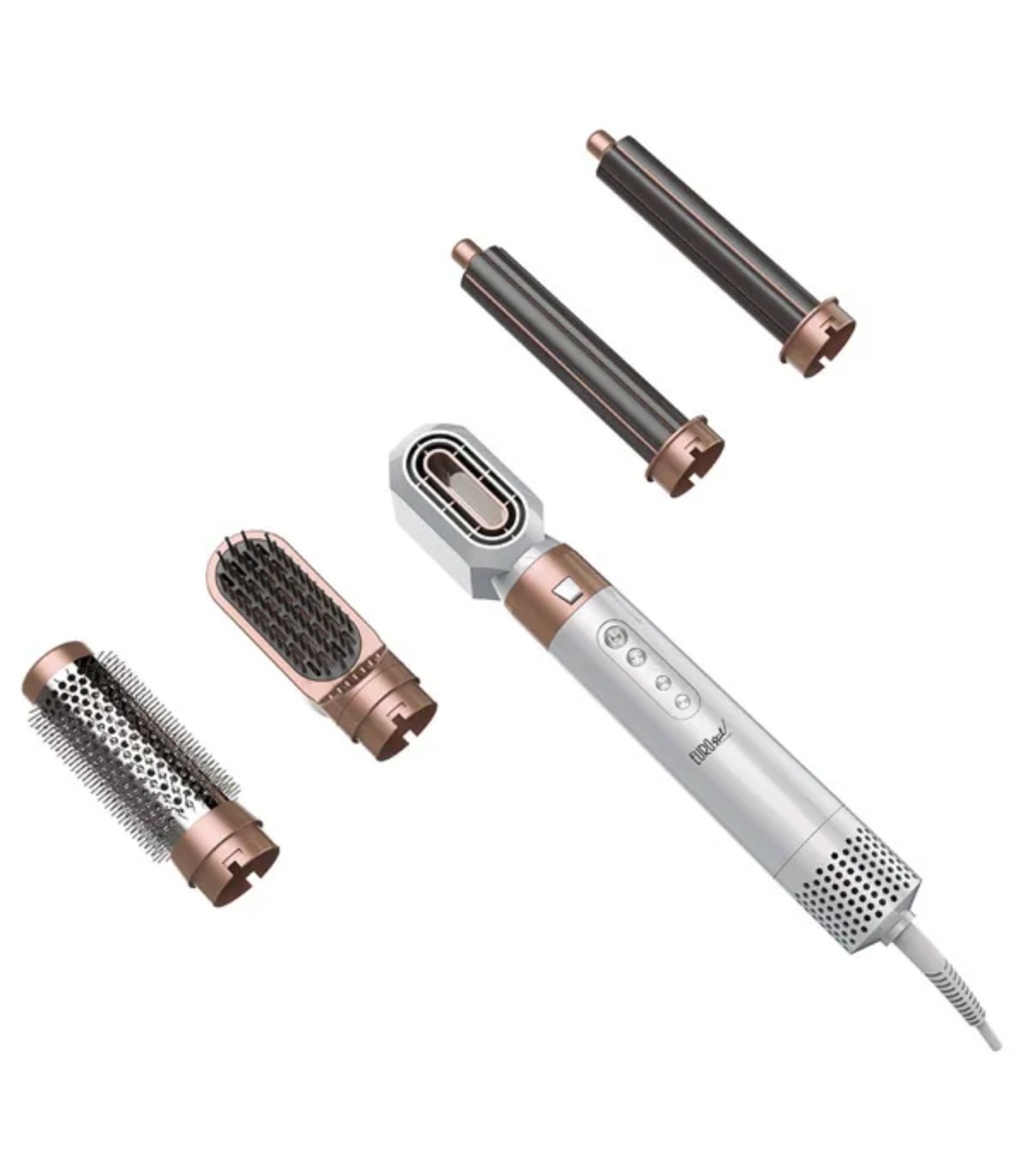 5 accessoires interchangeables : concentrateur, brosse ronde, brosse plate à picots, 2 fers à boucler