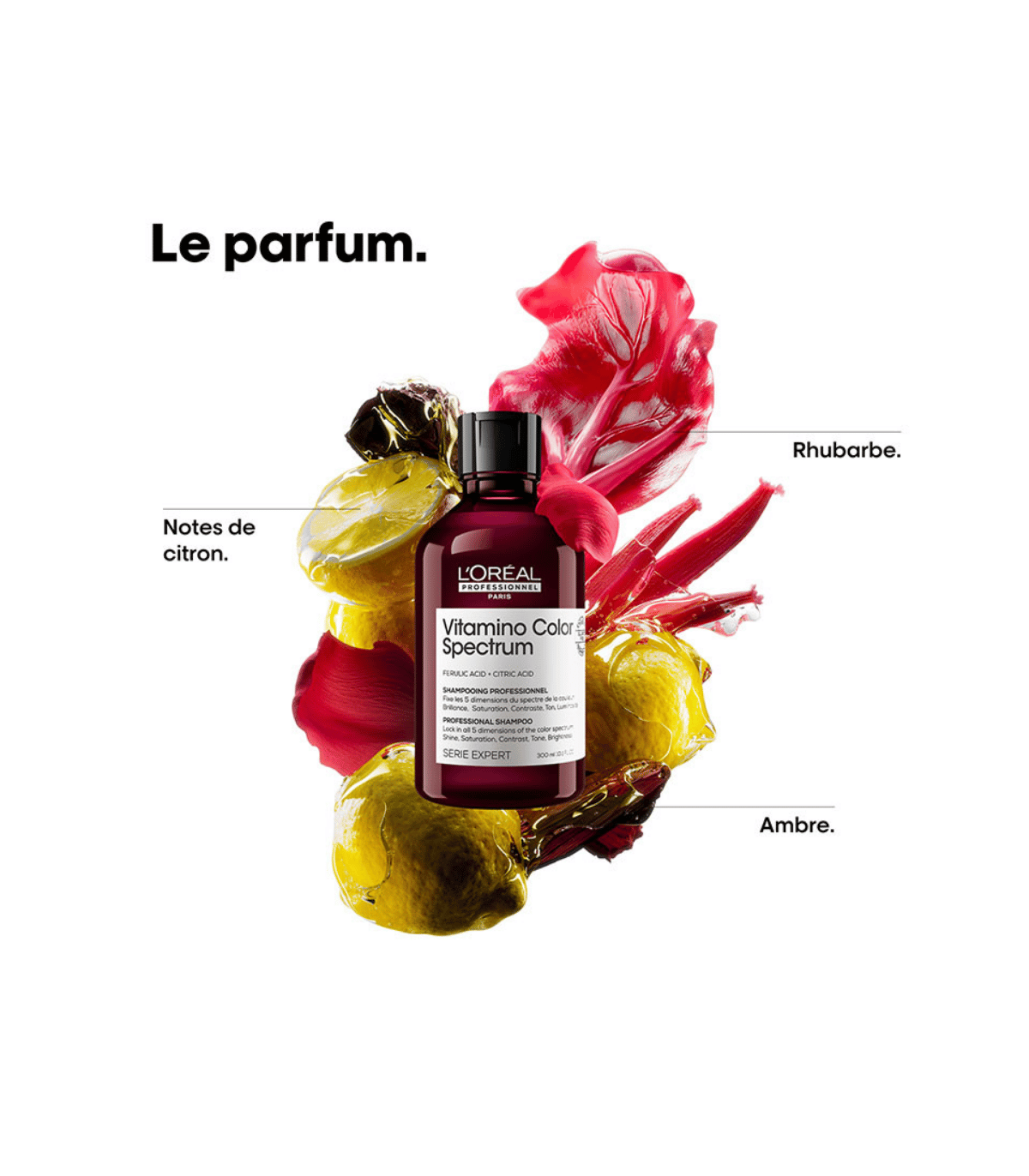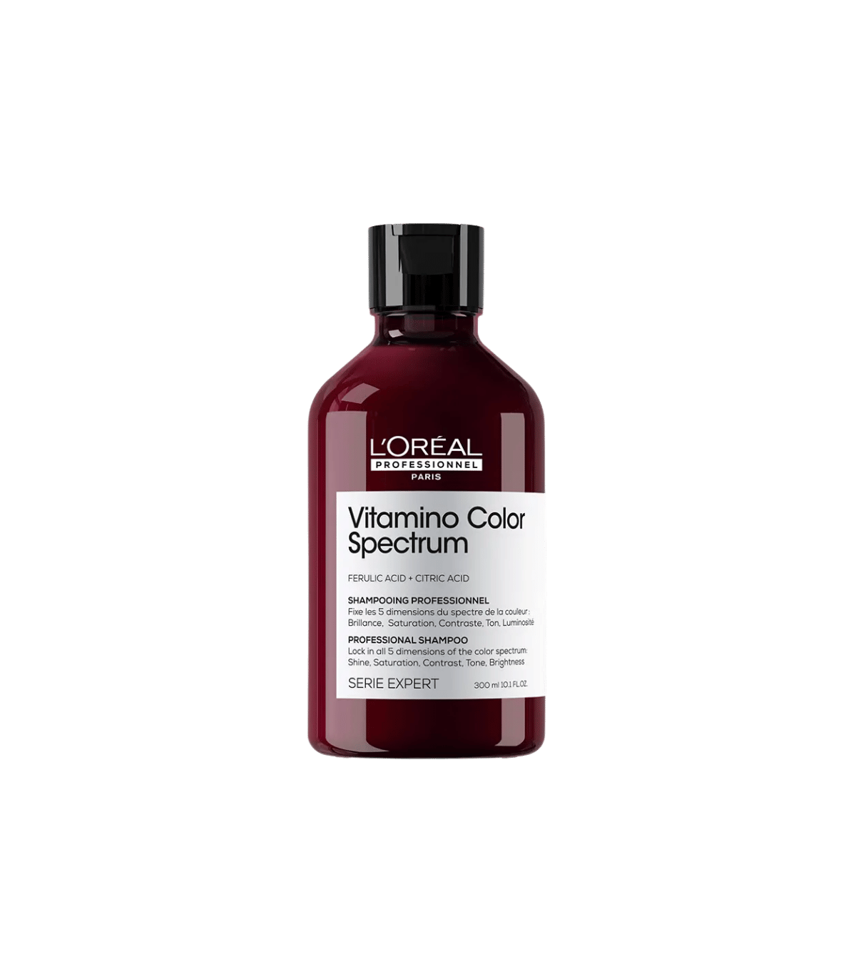 Shampoing 300 mlShampooing Vitamino Color Spectrum de L'Oréal Professionnel : Un shampooing professionnel conçu pour protéger et prolonger la couleur des cheveux colorés. Enrichi en acide férulique et acide citrique, il maintient une couleur éclatante jusqu'à 100 jours* tout en nettoyant en douceur la fibre capillaire.