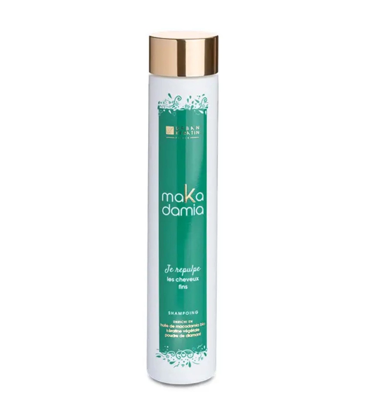Shampoing repulpant pour cheveux fins enrichi en kératine végétale, poudre de diamant et huile de macadamia bio. J’apporte de la tonicité, de la matière et du volume dès la racine.