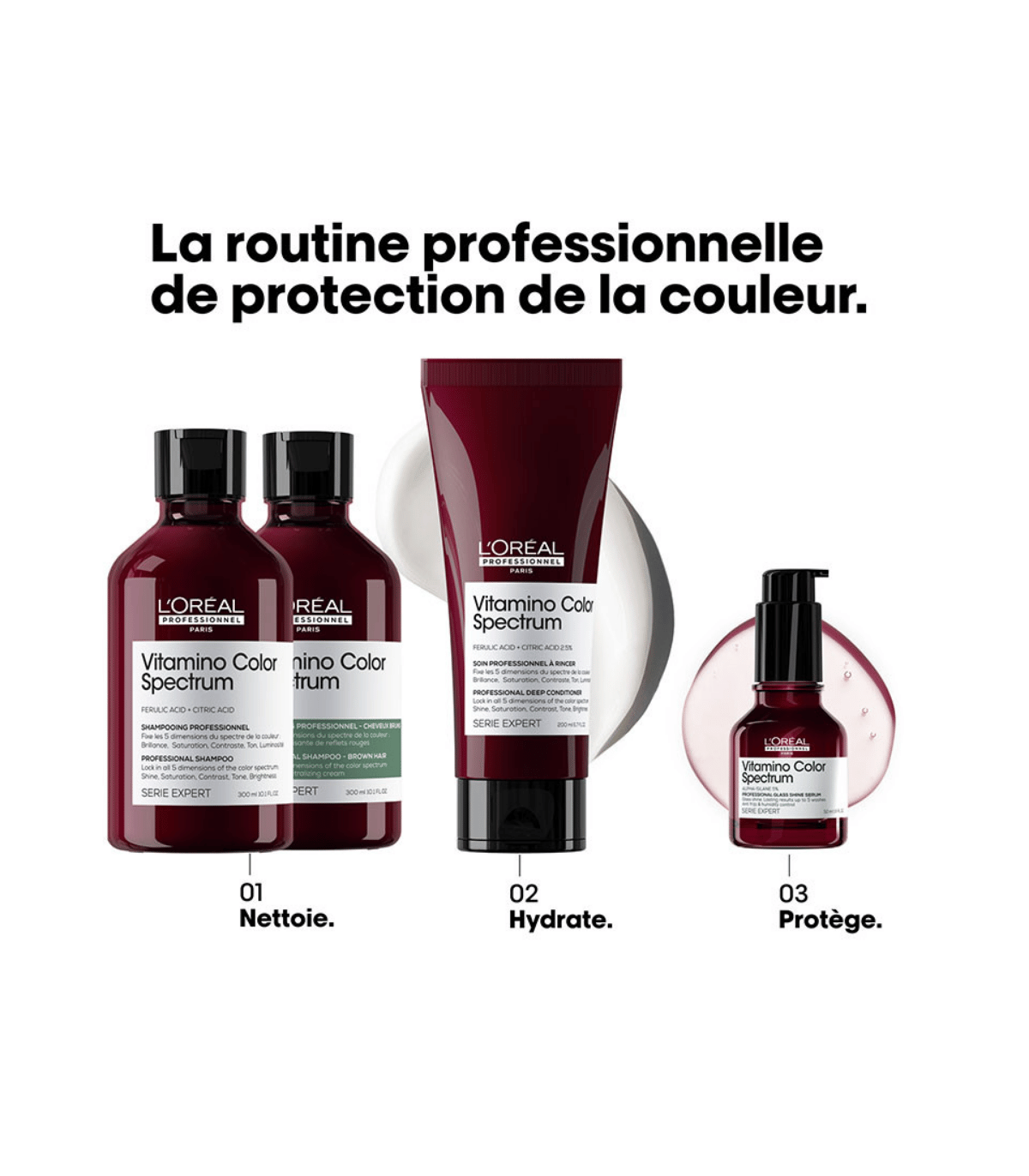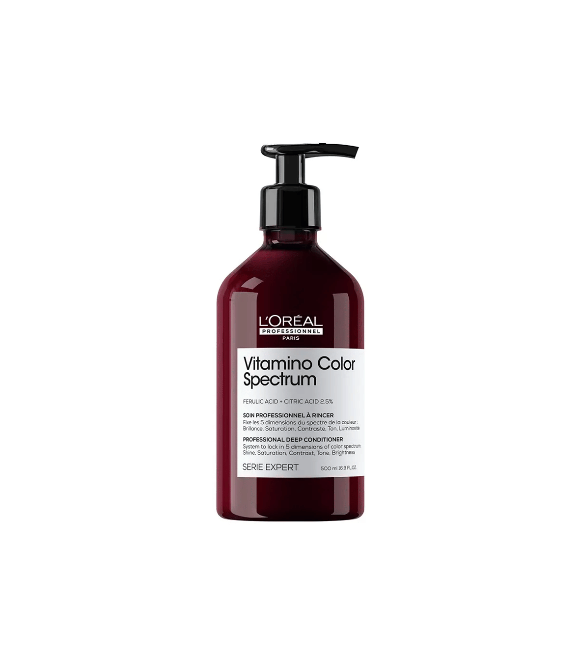 Après-shampoing 500 mlRevitalisant Vitamino Color Spectrum de L'Oréal Professionnel : Un après-shampooing innovant conçu pour les cheveux colorés, qui prolonge la brillance et la couleur jusqu'à 100 jours*. Formulé avec de l'acide férulique et citrique, ce revitalisant offre une protection optimale et une douceur exceptionnelle.