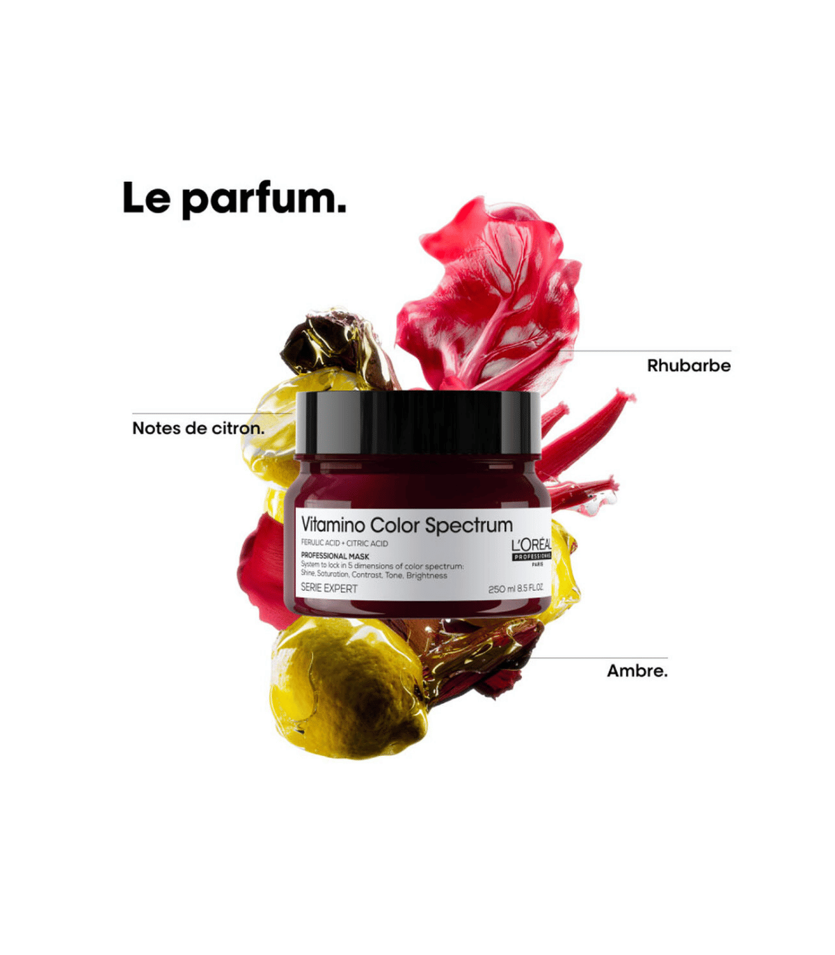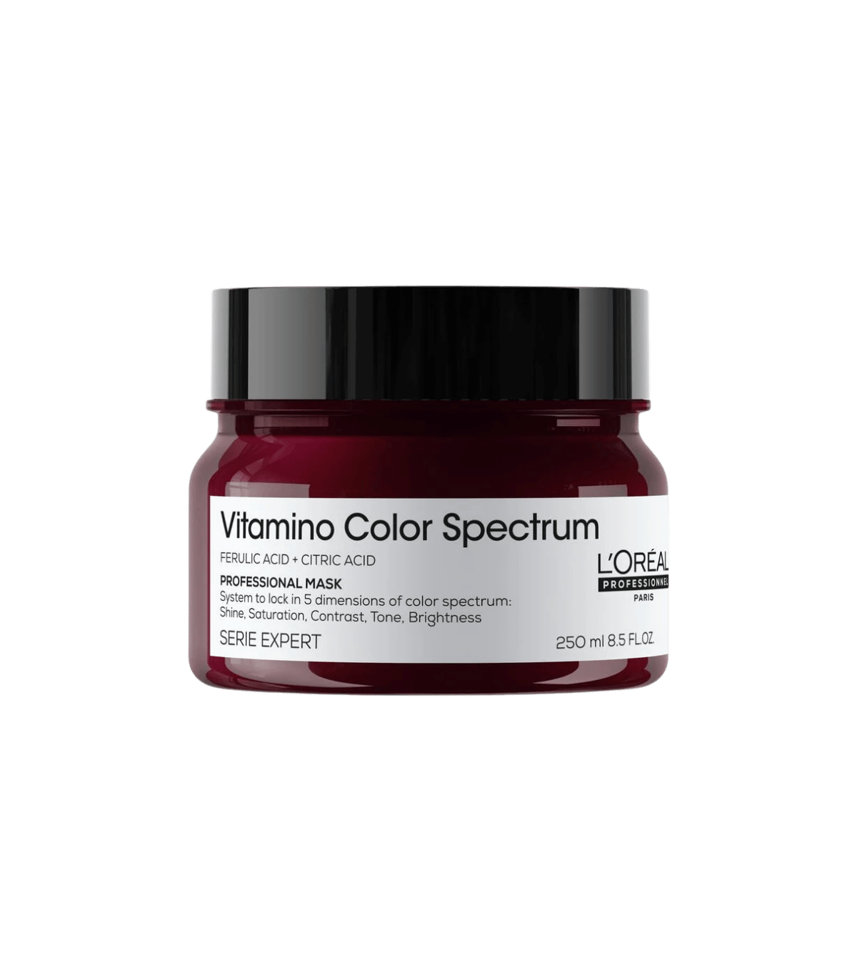 Masque 250 mlMasque Fixateur de Couleur Vitamino Color Spectrum de L'Oréal Professionnel : Un soin intensif conçu pour nourrir, hydrater et fixer durablement les pigments des cheveux colorés. Formulé avec de l'acide férulique et citrique, ce masque protège et prolonge l'éclat de votre coloration tout en offrant une douceur exceptionnelle.