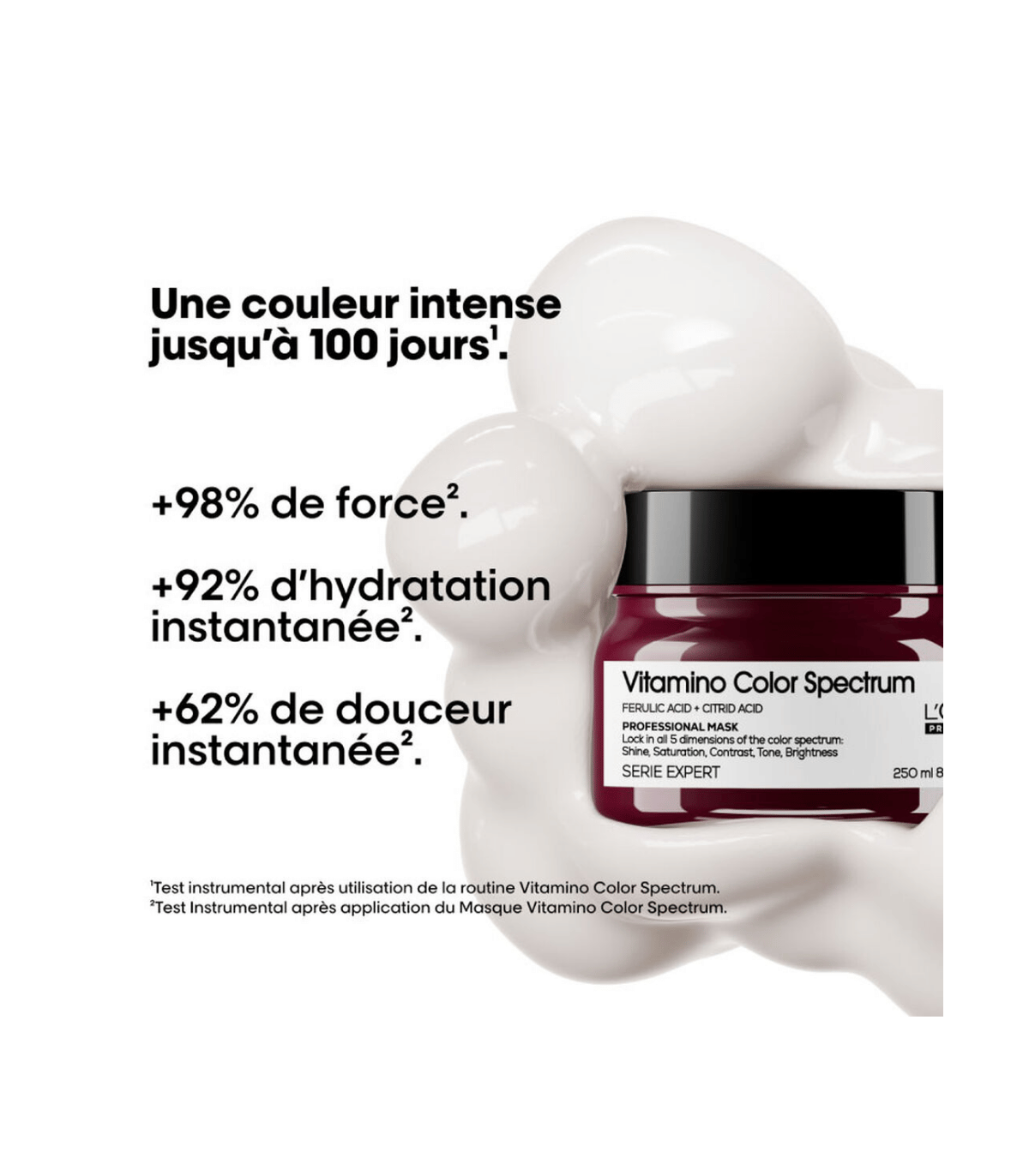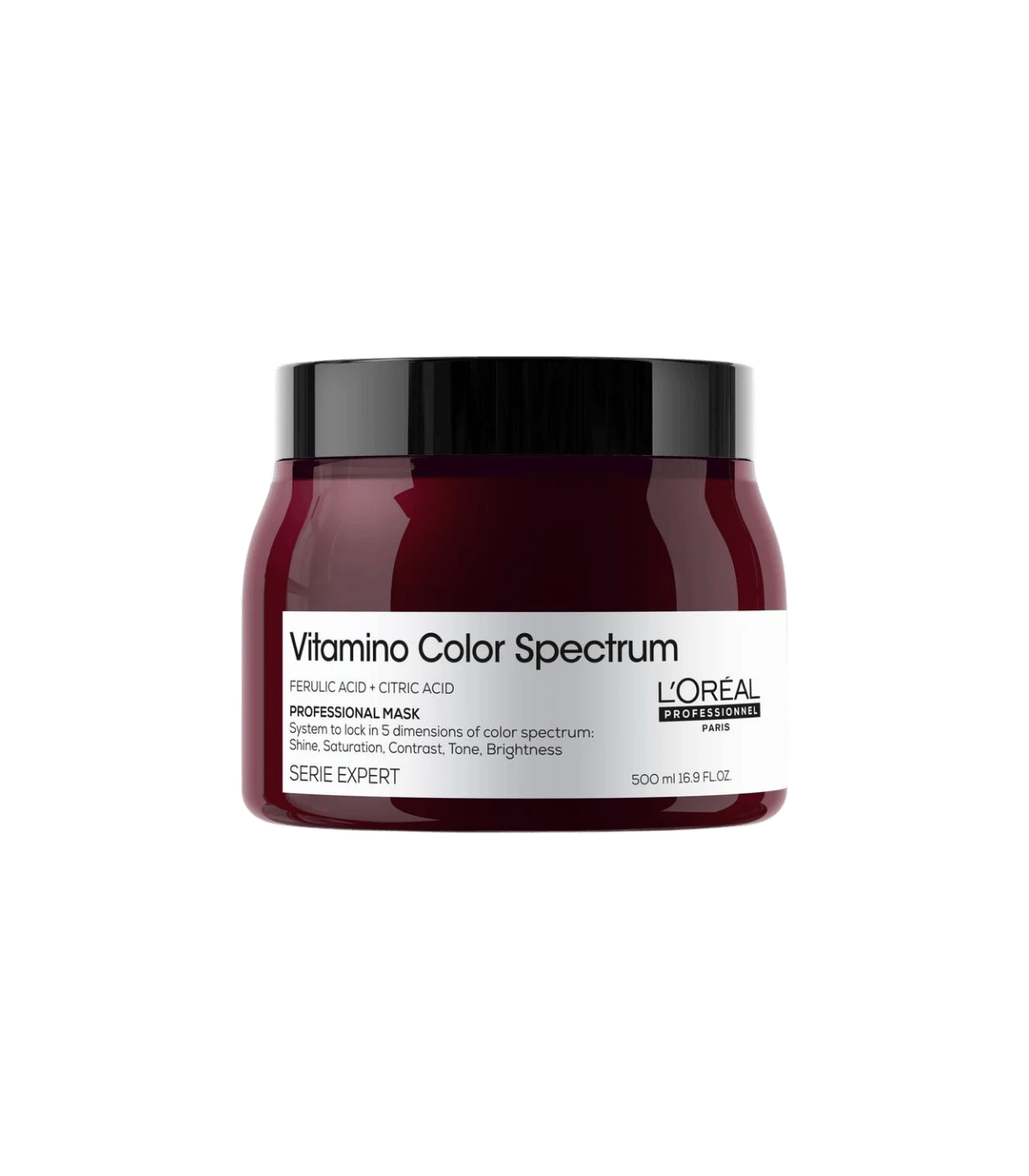 Masque 500 mlMasque Fixateur de Couleur Vitamino Color Spectrum de L'Oréal Professionnel : Un soin intensif conçu pour nourrir, hydrater et fixer durablement les pigments des cheveux colorés. Formulé avec de l'acide férulique et citrique, ce masque protège et prolonge l'éclat de votre coloration tout en offrant une douceur exceptionnelle.
