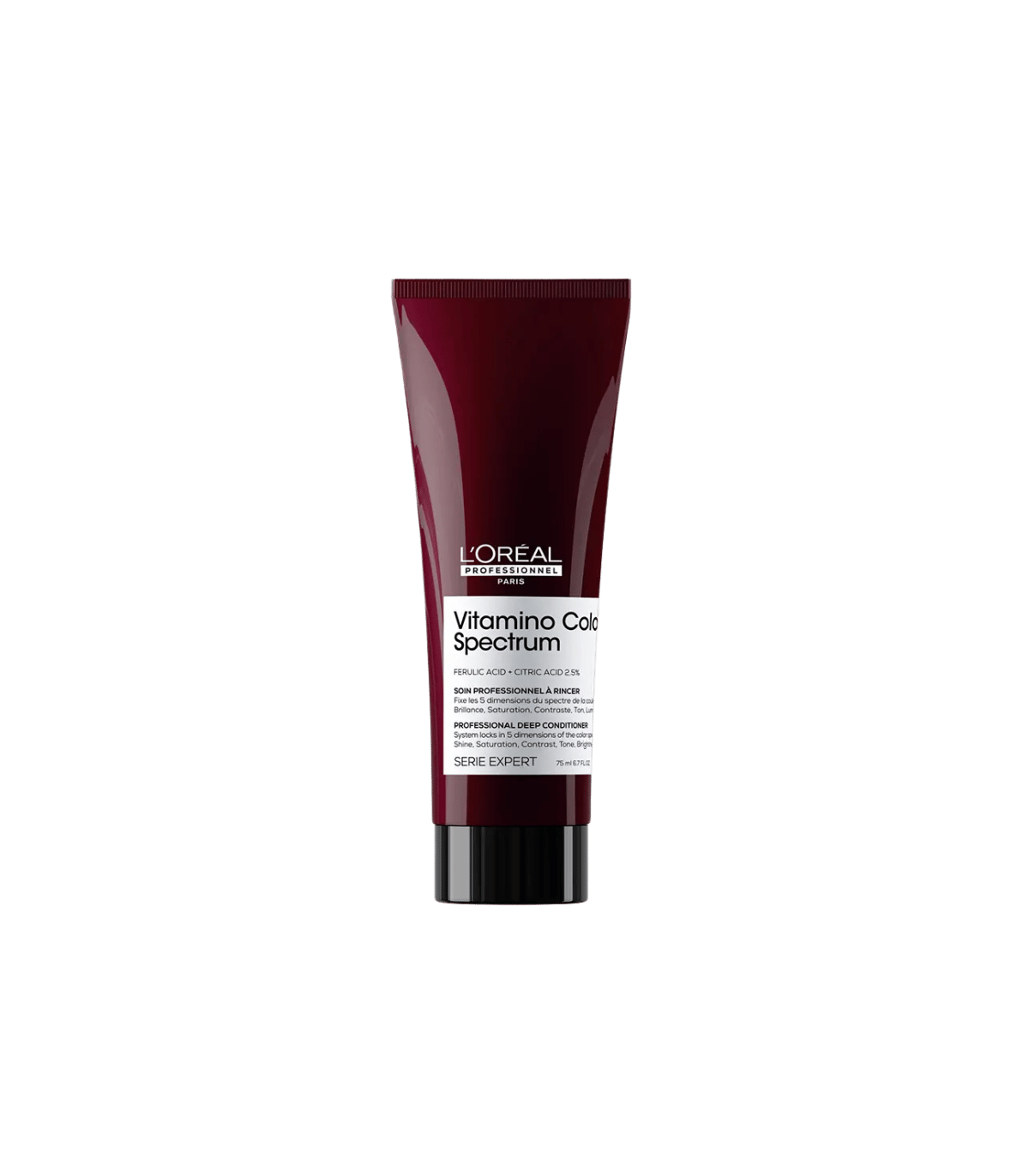 Après-shampoing 75 mlRevitalisant Vitamino Color Spectrum de L'Oréal Professionnel : Un après-shampooing innovant conçu pour les cheveux colorés, qui prolonge la brillance et la couleur jusqu'à 100 jours*. Formulé avec de l'acide férulique et citrique, ce revitalisant offre une protection optimale et une douceur exceptionnelle.