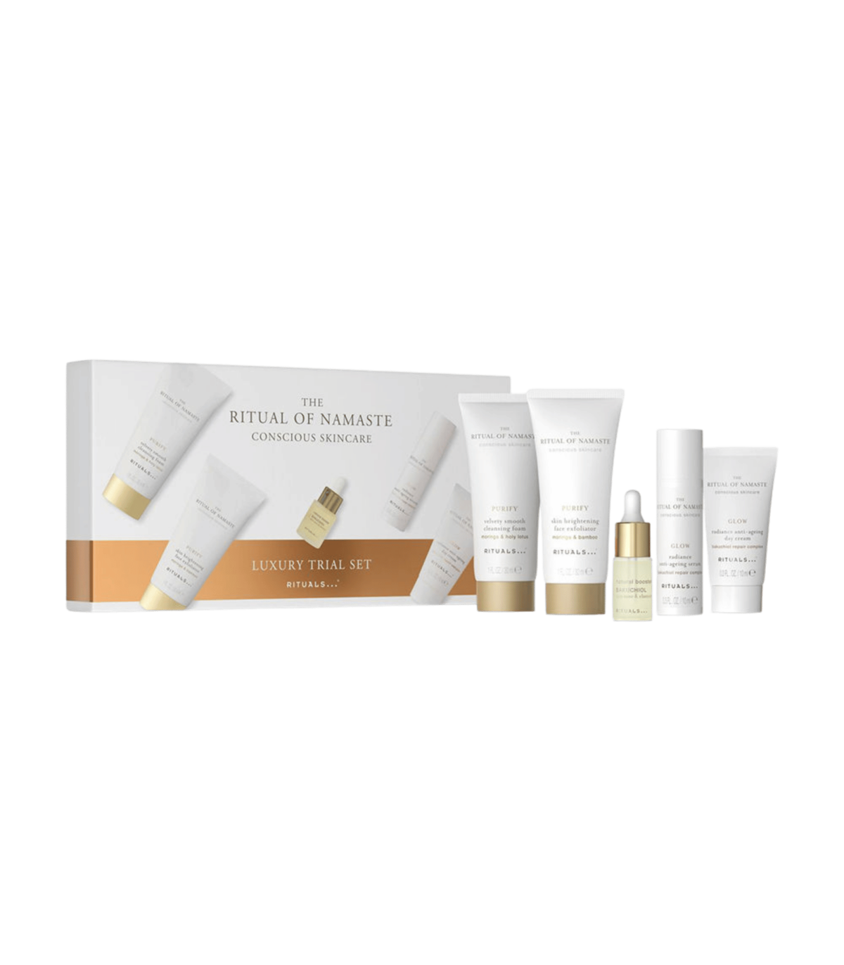 The Ritual of Namaste Anti-Ageing Serum: Aqua/Water, Glycerin, Silybum Marianum Seed Oil, Betaine, Xylitylglucoside, Cetearyl Alcohol, Tephrosia Purpurea Seed Extract, Salicornia Herbacea Extract, Nelumbo Nucifera Flower Extract, Sesamum Indicum (Sesame) Seed Oil, Bakuchiol, Sodium Hyaluronate, Anhydroxylitol, Xylitol, Cetyl Palmitate, Helianthus Annuus (Sunflower) Seed Oil, Dimethicone, Caprylic/Capric Triglyceride, Sodium Stearoyl Glutamate, Sorbitan Palmitate, Sorbitan Oleate, Acacia Senegal Gum, Sclerotium Gum, Xanthan Gum, Tocopherol, Propanediol, Tetrasodium Glutamate Diacetate, Lactic Acid, Citric Acid, Sodium Hydroxide, Benzoic Acid, Dehydroacetic Acid, Sodium Benzoate, Potassium Sorbate, Benzyl Alcohol, Linalool, Limonene, Citronellol, Geraniol, Parfum/Fragrance.