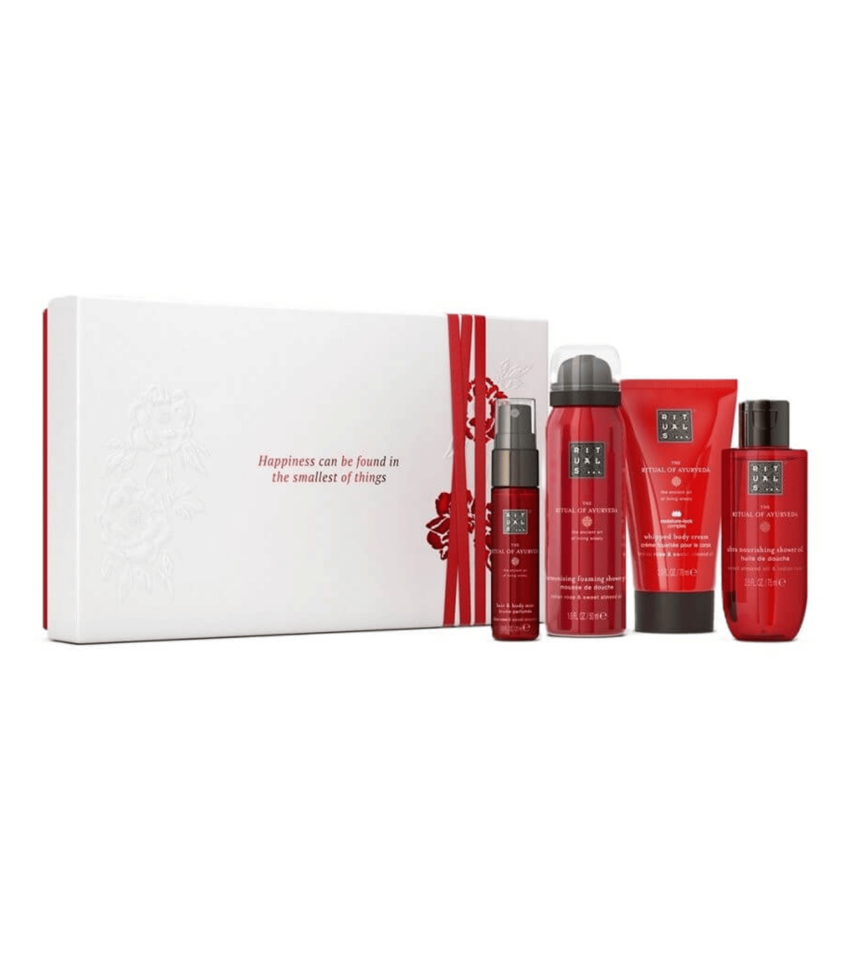 The Ritual of Ayurveda Hair & Body Mist: Aqua/Water, PEG-40 Hydrogenated Castor Oil, Trideceth-9, Parfum/Fragrance, Rosa Damascena (Damask Rose) Flower Water, Prunus Amygdalus Dulcis (Sweet Almond) Seed Extract, Phenoxyethanol, Propylene Glycol, Hexyl Cinnamal, Limonene, Linalool, Coumarin, Ethylhexylglycerin, Citronellol, Glycerin, Benzyl Benzoate, Citral, Sodium Hydroxide, Benzyl Alcohol, Alpha-Isomethyl Ionone, Cinnamyl Alcohol, Benzyl Cinnamate, Geraniol, Potassium Sorbate, Sodium Benzoate, Sorbic Acid.The Ritual of Ayurveda Shower Oil: Ricinus Communis (Castor) Seed Oil, Canola Oil, Laureth-3, MIPA-Laureth Sulfate, Parfum/Fragrance, Laureth-7 Citrate, Rosa Damascena Bud Extract, Prunus Amygdalus Dulcis (Sweet Almond) Oil, Tocopherol, Helianthus Annuus (Sunflower) Hybrid Oil, Hydrogenated Palm Glycerides Citrate, Benzyl Alcohol, Linalool, Limonene, Hexyl Cinnamal, Coumarin, Citronellol, Benzyl Benzoate, Cinnamyl Alcohol, Geraniol, Benzyl Salicylate, Citral.The Ritual of Ayurveda Body Cream: Aqua/Water, Cetearyl Alcohol, Glycerin, Caprylic/Capric Triglyceride, Propylheptyl Caprylate, Undecane, Helianthus Annuus (Sunflower) Hybrid Oil, Parfum/Fragrance, Prunus Amygdalus Dulcis (Sweet Almond) Oil, Rosa Damascena Flower Oil, Tocopheryl Acetate, Allantoin, Tocopherol, Ubiquinone, Tridecane, Isohexadecane, Cetyl Palmitate, Ceteareth-20, Glyceryl Stearate, Propylene Glycol, Carbomer, Sodium Polyacrylate, Ceteareth-12, PEG-40 Hydrogenated Castor Oil, Phenoxyethanol, Caprylyl Glycol, Potassium Sorbate, Benzyl Alcohol, Sodium Benzoate, Linalool, Hexyl Cinnamal, Limonene, Coumarin, Citronellol, Benzyl Benzoate, Geraniol, Cinnamyl Alcohol, Citral, Sodium Hydroxide, Citric Acid.The Ritual of Ayurveda Foaming Shower Gel: Aqua/Water, Sodium Coco-Sulfate, Decyl Glucoside, Isopentane, Coco-Glucoside, Glycerin, PEG-120 Methyl Glucose Dioleate, Isopropyl Palmitate, Parfum/Fragrance, Isobutane, Rosa Damascena Flower Oil, Prunus Amygdalus Dulcis (Sweet Almond) Oil, Citric Acid, Sodium Benzoate, Guar Hydroxypropyltrimonium Chloride, Hexyl Cinnamal, Limonene, Linalool, Coumarin, Citronellol, Benzyl Benzoate.