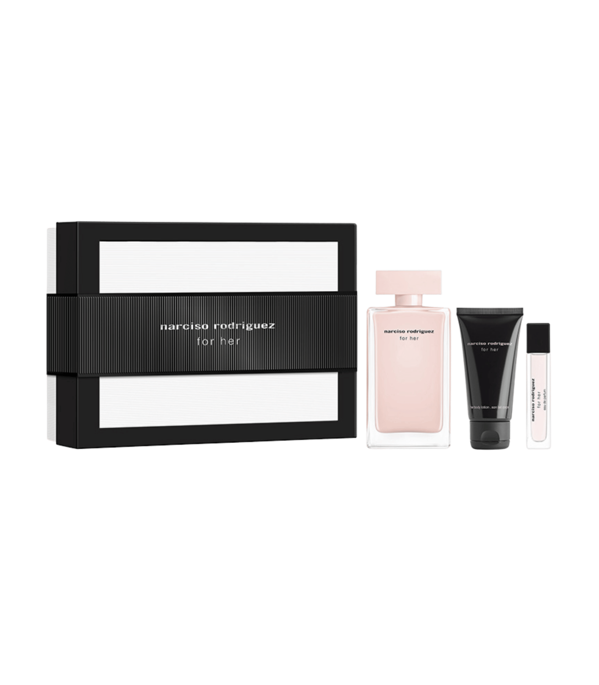 Coffret eau de parfum 100 ml + 10 mlOffrez le coffret For Her de Narciso Rodriguez : Eau de Parfum 100 ml, lotion corps 50 ml et mini 10 ml. Parfum floral musqué aux notes de rose, pulpe de pêche, ambre et patchouli — sensualité pure et raffinée.
