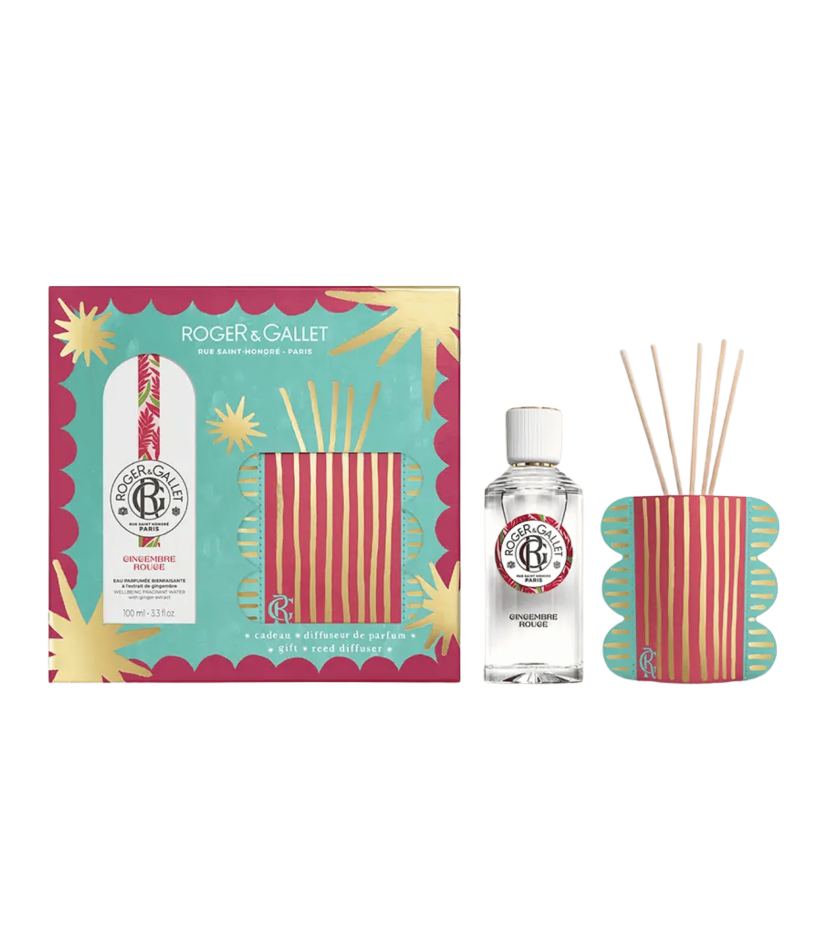 ROGER & GALLET — Coffret Bien‑Être Gingembre Rouge — Eau Parfumée 100 ml + Mikado (Gingembre • Fleur d’oranger • Benjoin)