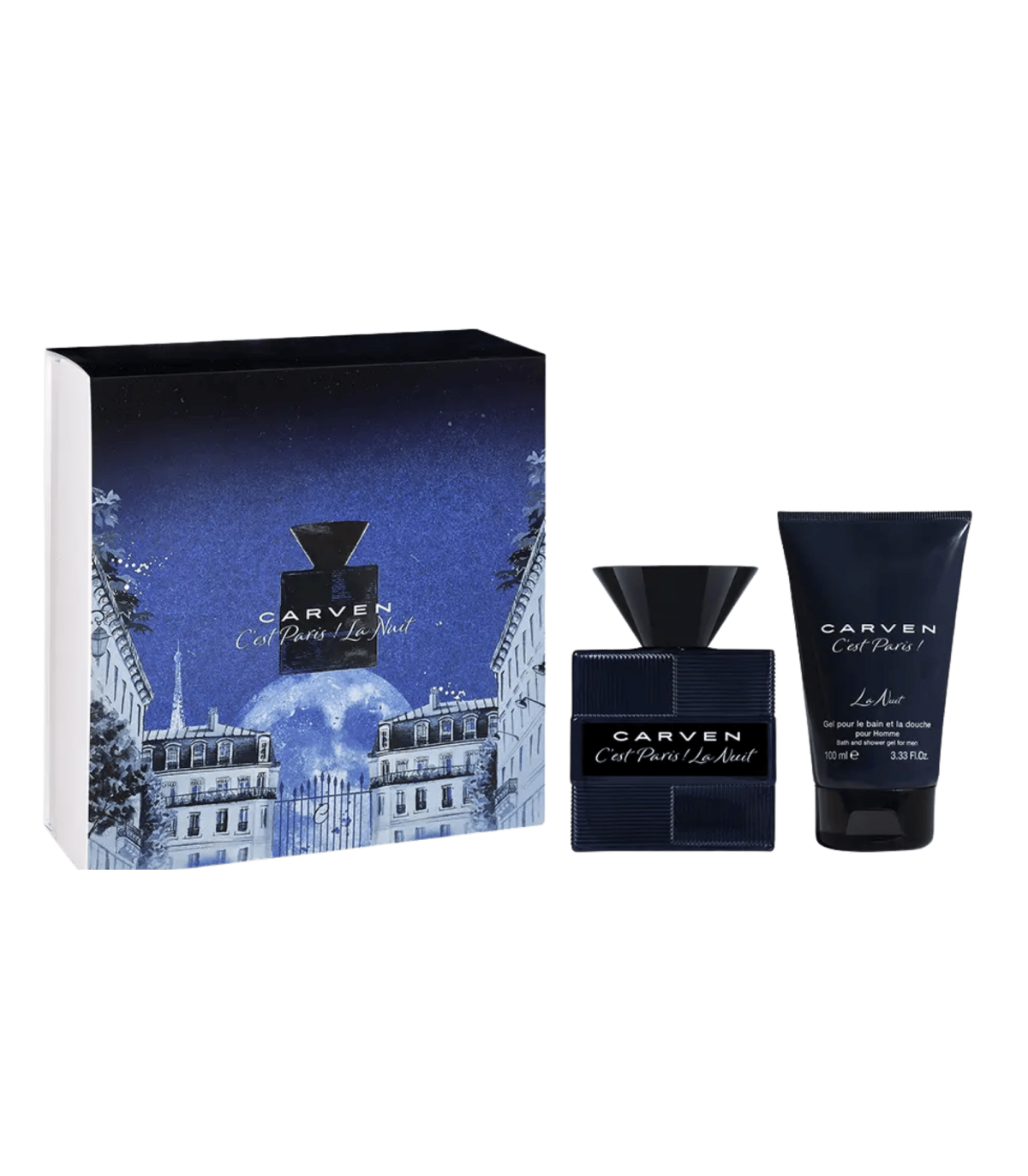C'EST PARIS LA NUIT POUR HOMME : Eau de Parfum 100 ml et Gel Douche 100 ml. Une fragrance aromatique‑musc mêlant bergamote, néroli et lavande à un cœur de labdanum, sauge sclarée et accord animal, soutenue par un fond de musc blanc, cashmeran et santal pour un sillage intense et moderne.