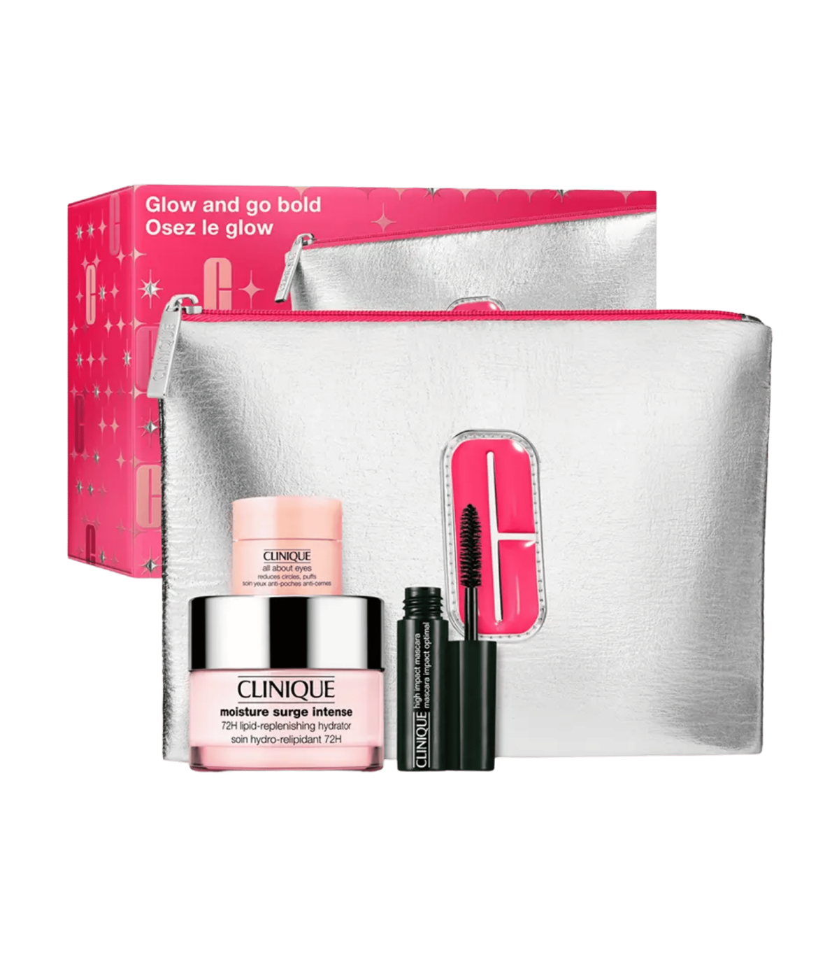 Clinique — Moisture Surge Glow and Go Bold — Coffret Gel‑Crème Intense 50 ml + Contour yeux 5 ml + Mascara 3,5 ml + Trousse