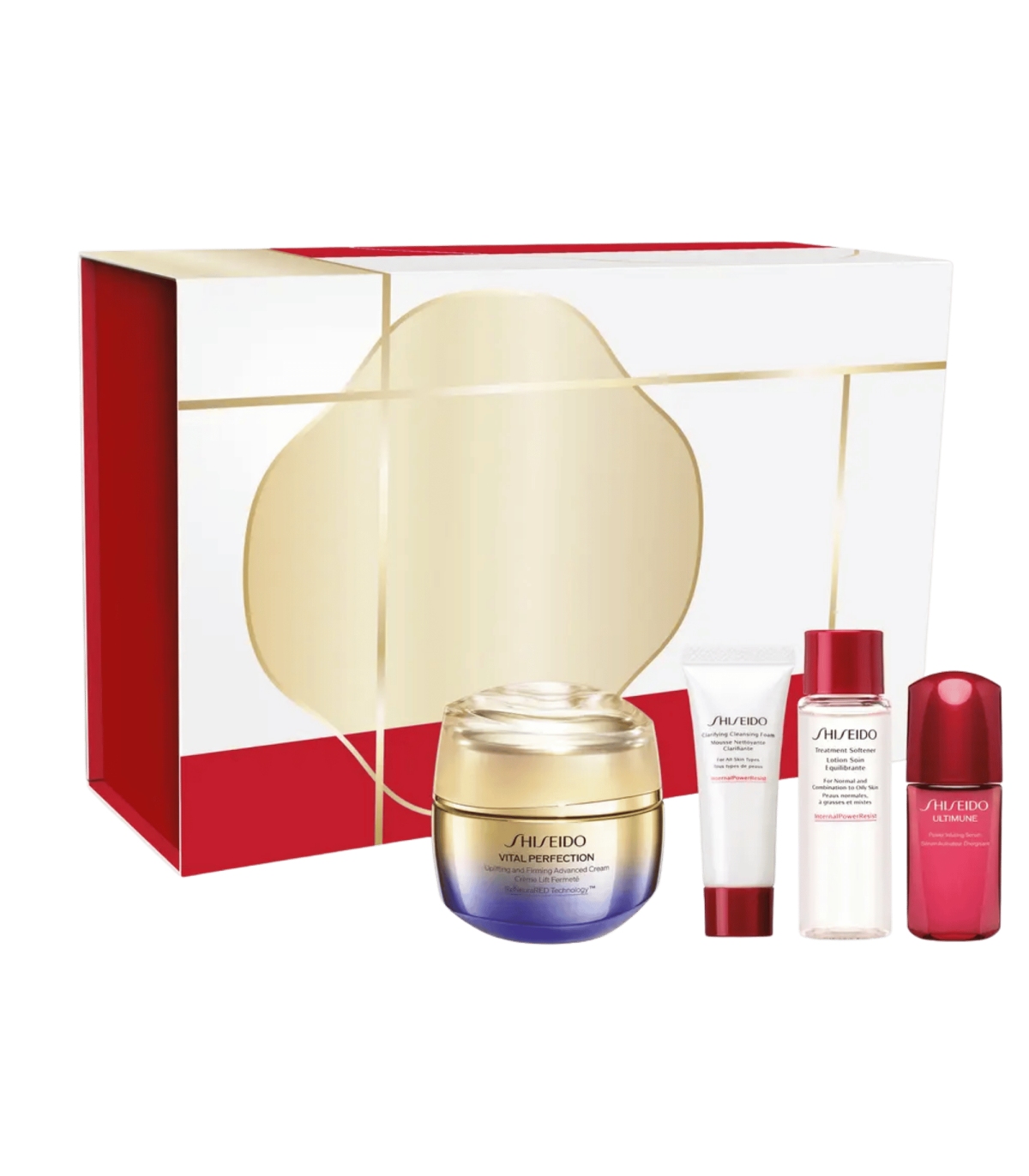 Le coffret SHISEIDO Vital Perfection réunit la crème élévante et raffermissante et des soins complémentaires pour une routine visage complète axée sur fermeté, lissage et éclat. Grâce à la technologie ReNeura Technology++™, la crème accélère la réactivité de la peau et favorise des résultats visibles rapidement : ovale redéfini, texture lissée et peau plus ferme dès une semaine d’utilisation. Sa texture riche protège du dessèchement et son parfum floral procure un effet calmant. Le kit inclut un nettoyant moussant doux pour préparer la peau, une lotion équilibrante pour optimiser l’absorption des actifs et un sérum concentré pour renforcer l’effet lifting. Convient à tous les types de peau.