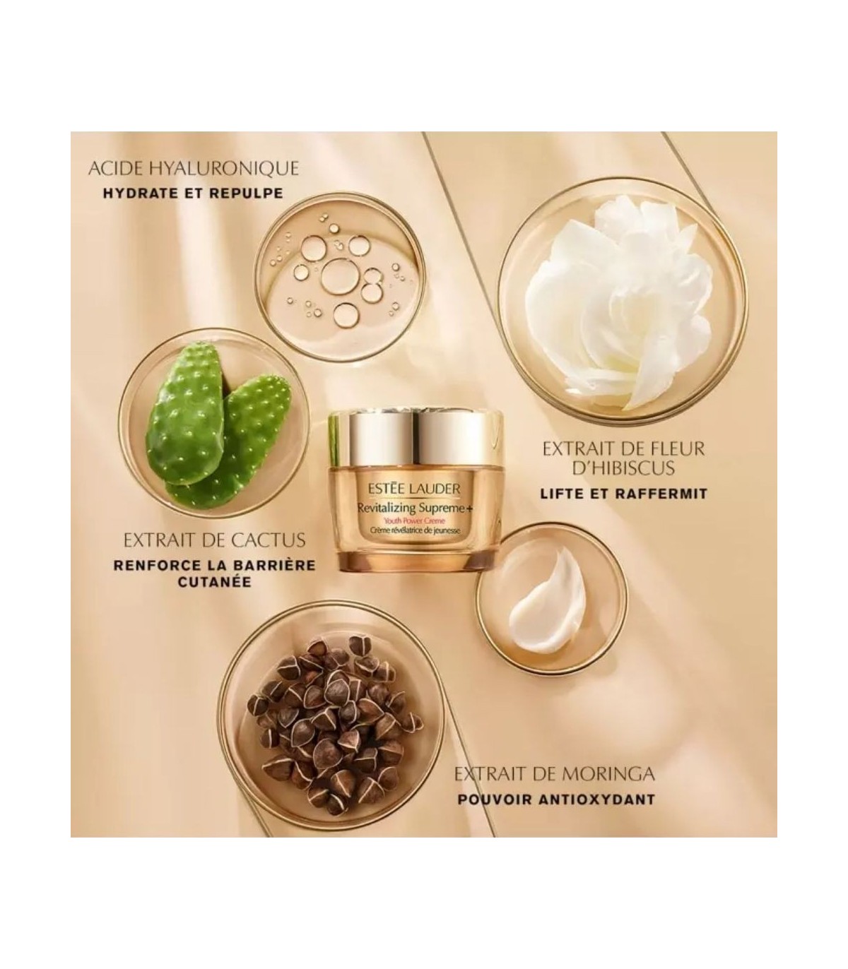 Les principaux actifs sont l’extrait d’Hibiscus Morning Bloom, l’extrait de Moringa, l’extrait de cellules souches de cactus et l’acide hyaluronique.