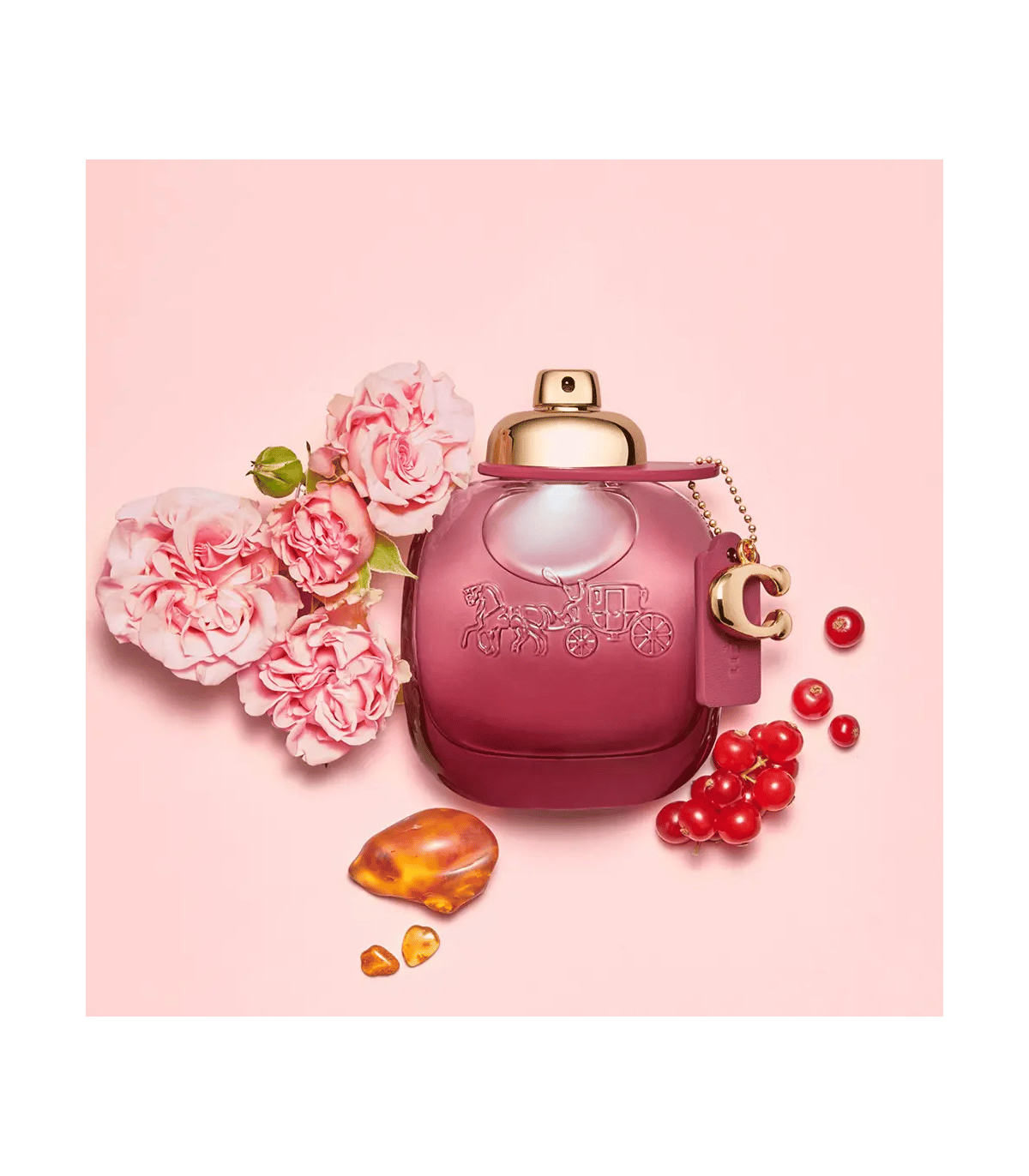 Eau de parfum 90 mlCoach Wild Rose, un parfum floral fruité alliant groseille juteuse, rose sauvage et ambroxan. Un souffle de nature libre et féminine.