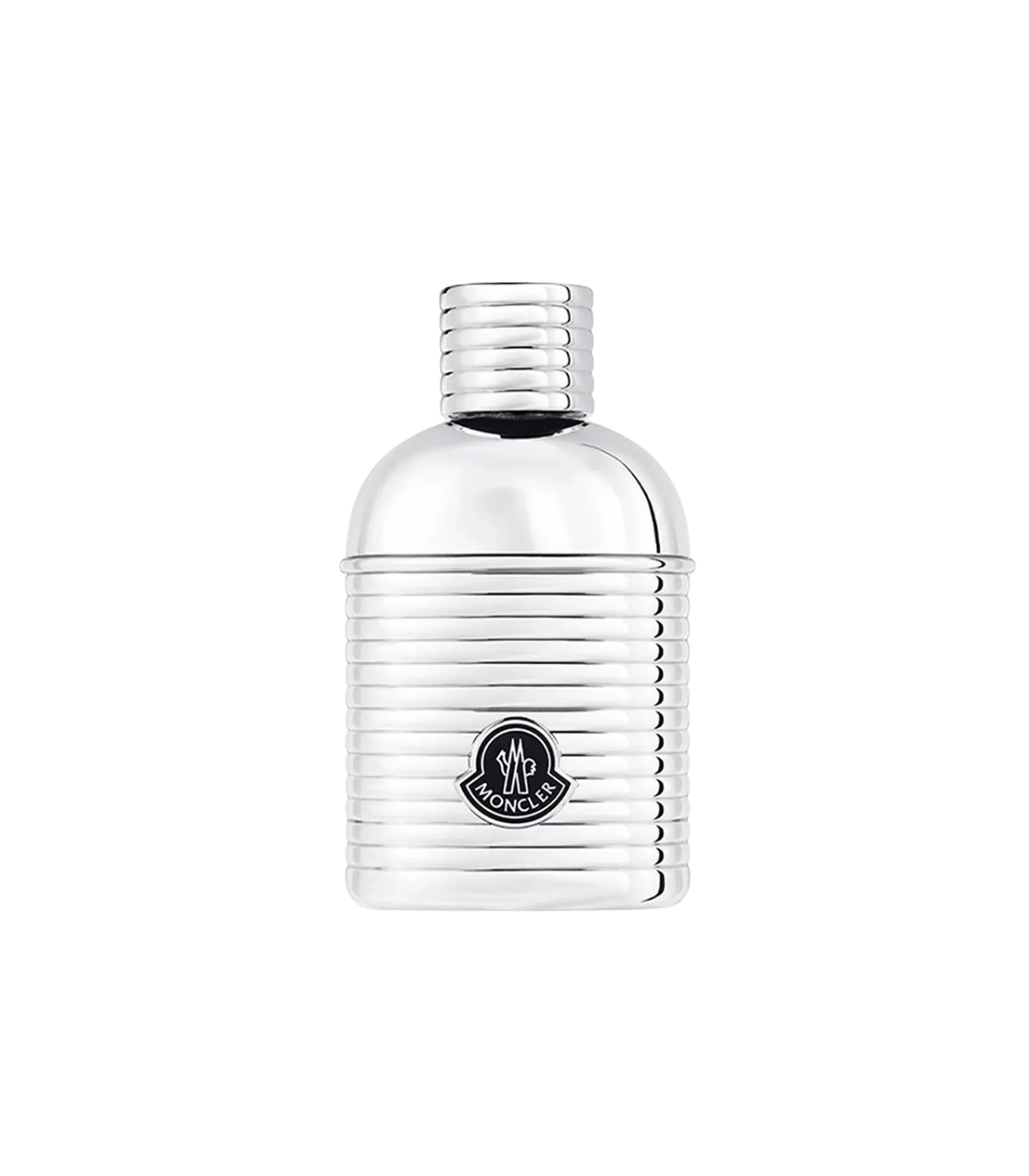 Le flacon, inspiré des cimes enneigées et des paysages montagneux, présente un design élégant avec un manchon et un bouchon argentés, un hommage aux origines montagnardes de Moncler et à ses vestes emblématiques.