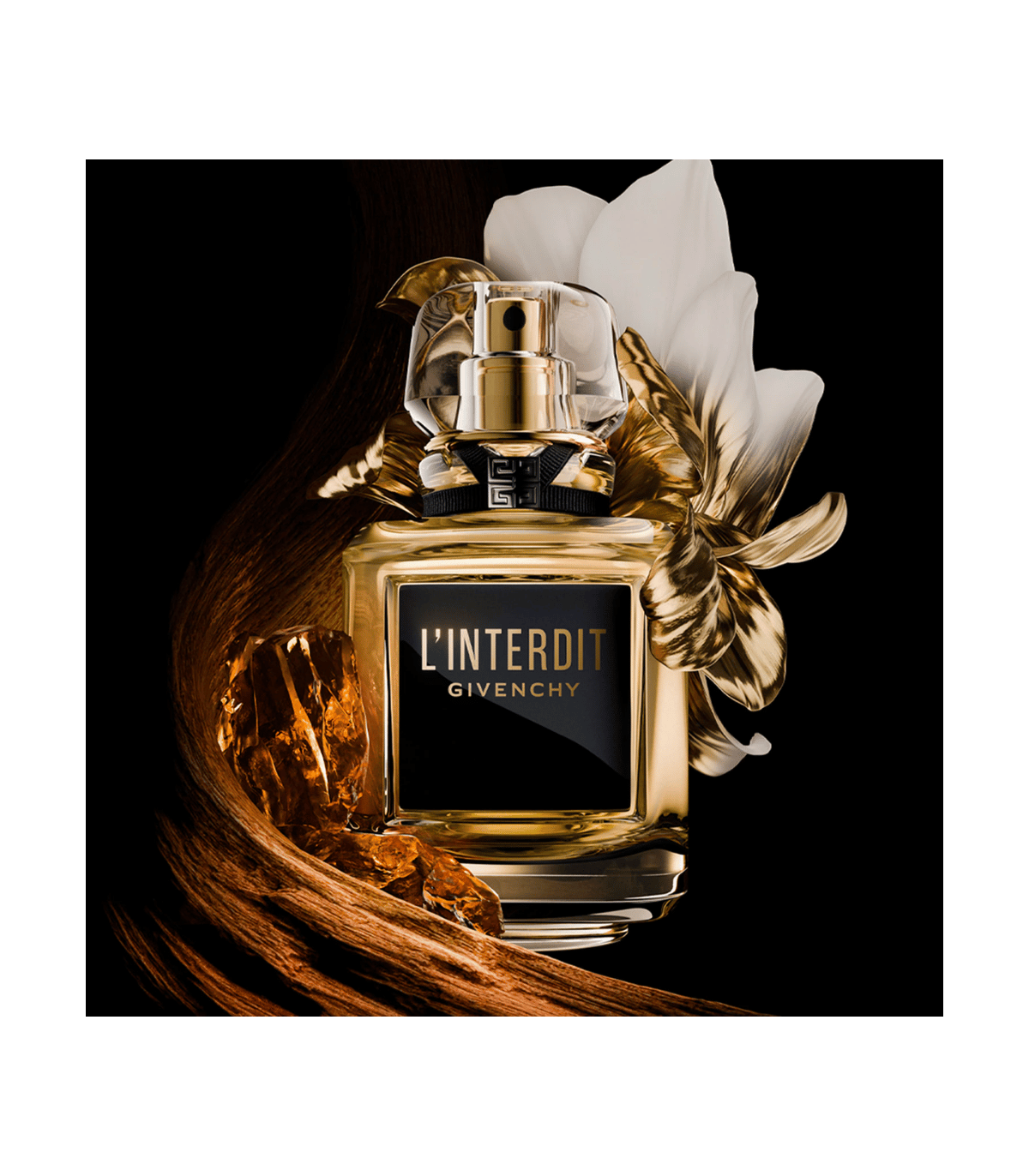 L'Interdit Parfum de Givenchy propose une réinterprétation précieuse et sophistiquée de la signature iconique. Le cœur floral, composé de fleur d’oranger, tubéreuse et jasmin, se pare d’un Absolu de Mimosa velouté et d’une Essence d’Amande amère qui apportent une vibration enivrante et gourmande. En fond, l’accord emblématique de vétiver et de patchouli révèle une profondeur boisée, complétée par des résines chaudes — absolu de myrrhe, opoponax et benjoin — qui étirent le sillage dans une dimension baumée et enveloppante.