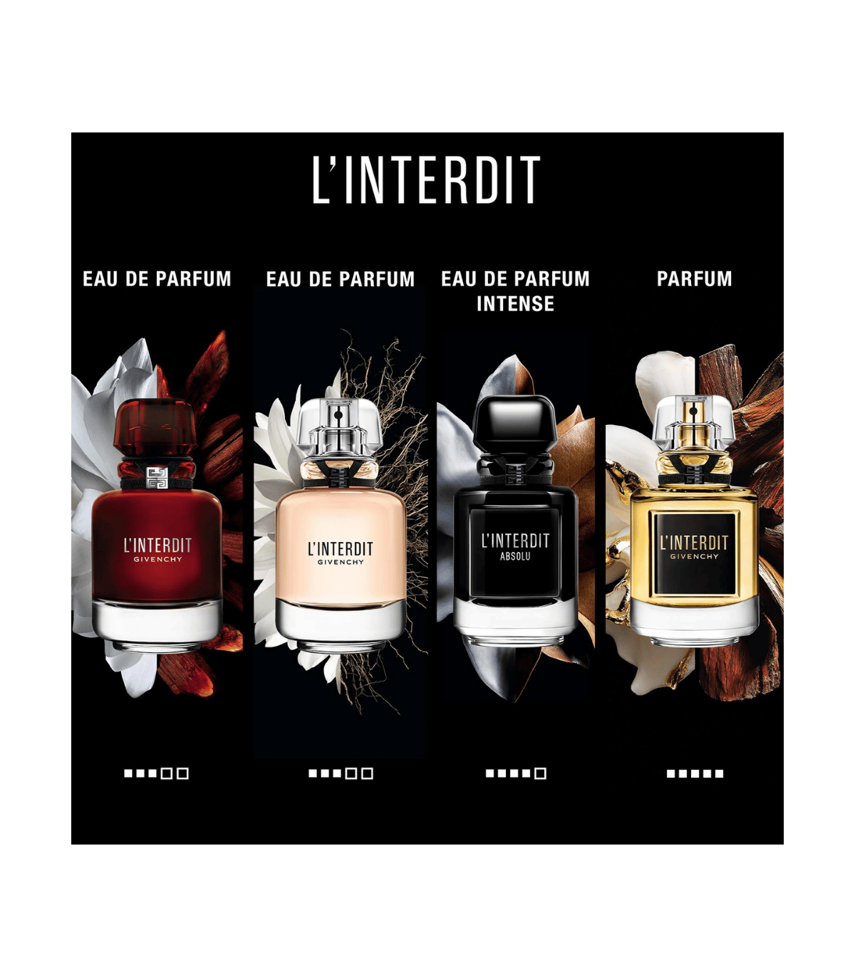 Le résultat : une fragrance florale‑boisée à la fois raffinée et addictive, plus intense et sophistiquée que jamais, pensée pour celles qui veulent dépasser l’ordinaire. Le flacon couture joue des contrastes — noir profond rehaussé de dorures et jeux de lumière — faisant écho à la tension olfactive entre pureté florale et sensualité résineuse. L'Interdit invite au dépassement et à la séduction subtile : une fragrance de caractère, à la fois précieuse et contemporaine.