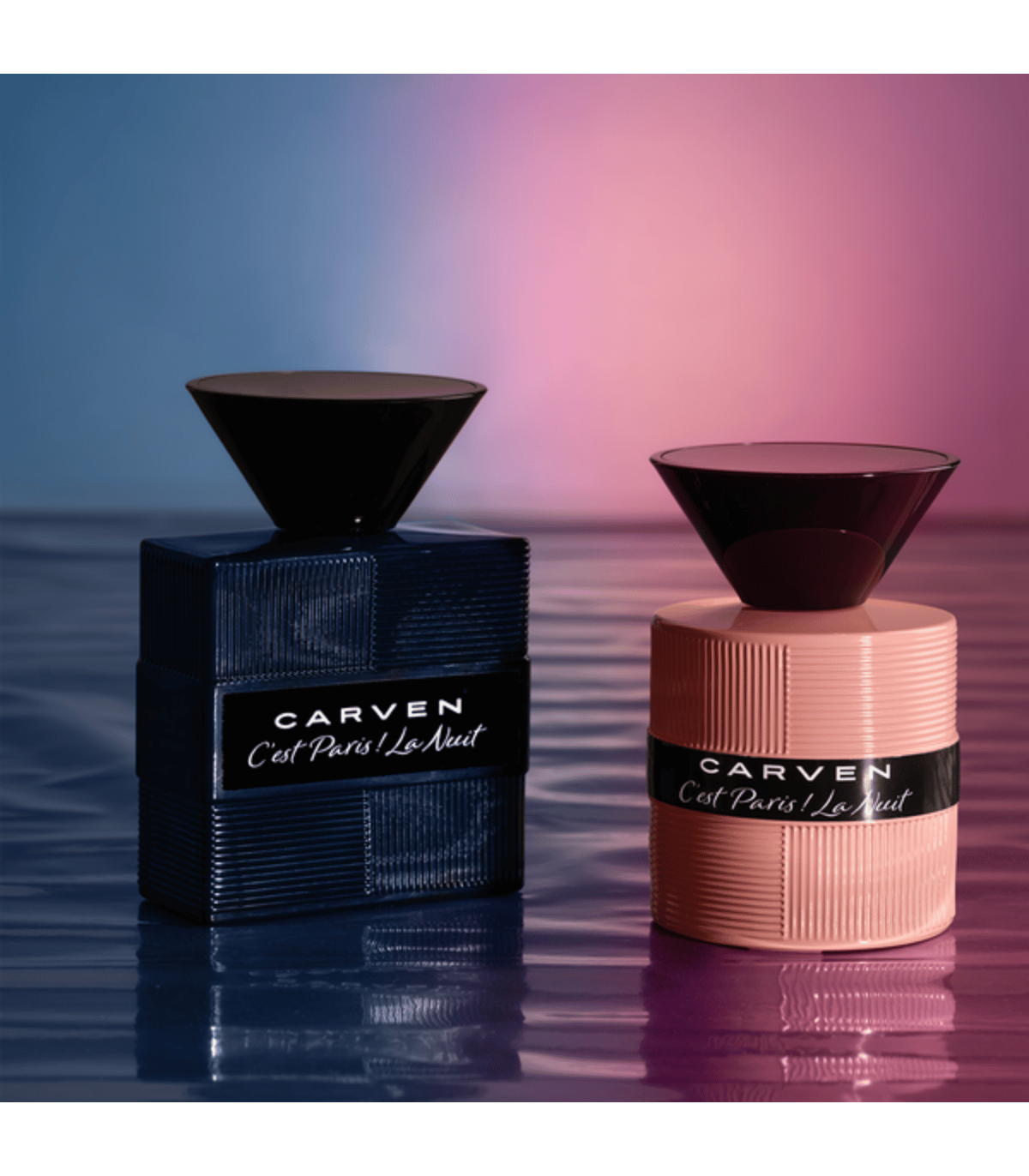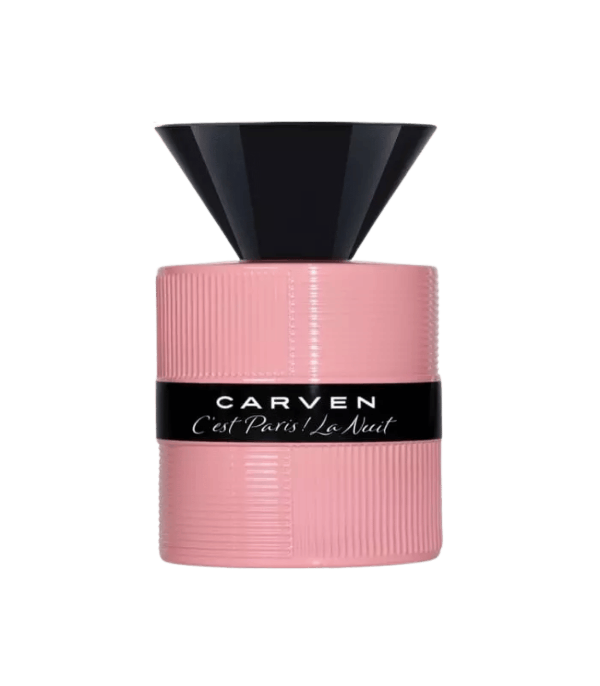 Carven C’est Paris ! La Nuit — Eau de Parfum : ouverture pétillante de mandarine et baie rose, note verte de rhubarbe, cœur intense de gardénia et fleurs blanches, fond vanillé et boisé — un parfum féminin nocturne, élégant et envoûtant.