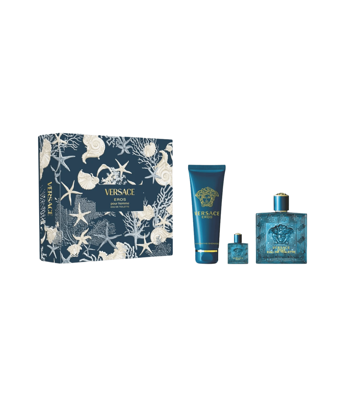 Coffret Versace Eros pour homme : Eau de Toilette 100 ml + gel douche + mini parfum. Un parfum sensuel et puissant inspiré des dieux grecs.