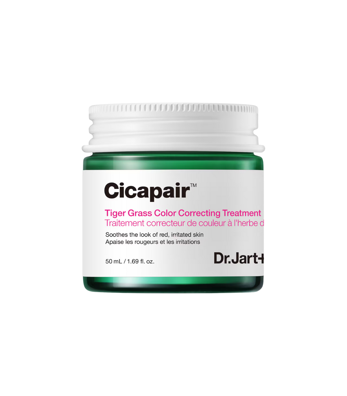 Soin correcteur de couleur à l'herbe du tigre - 50 mlSoin correcteur Cicapair™ Dr.Jart+ — neutralise les rougeurs, unifie et apaise. Fini mat, adapté aux peaux claires. 50 ml.
