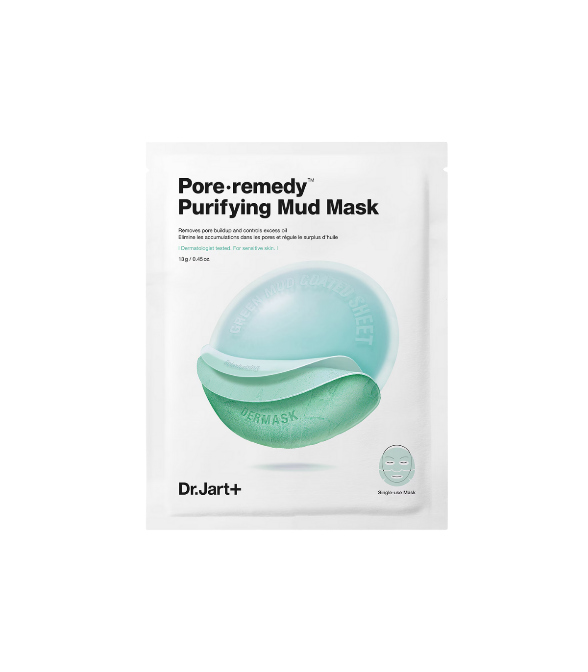 Le Pore·Remedy Purifying Mud Mask de DR.JART+ est un masque boue verte en tissu conçu pour purifier la peau sujette aux imperfections.