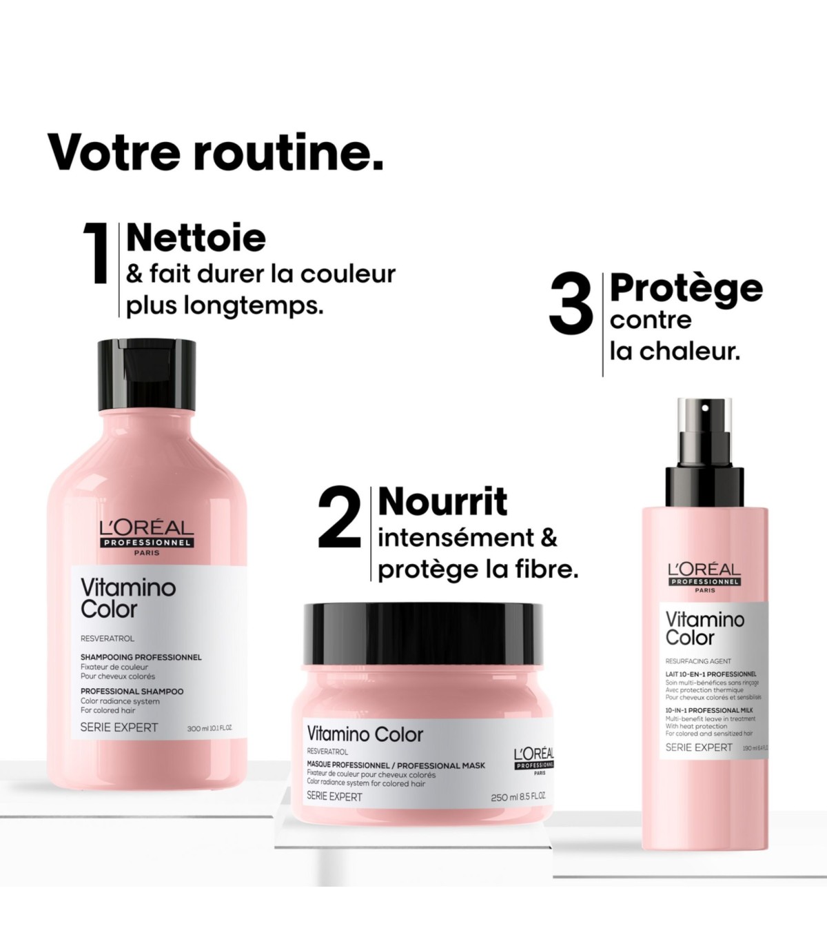 Pour un résultat optimal : utiliser avec la routine complète Vitamino Color (shampooing + masque + lait 10‑en‑1).