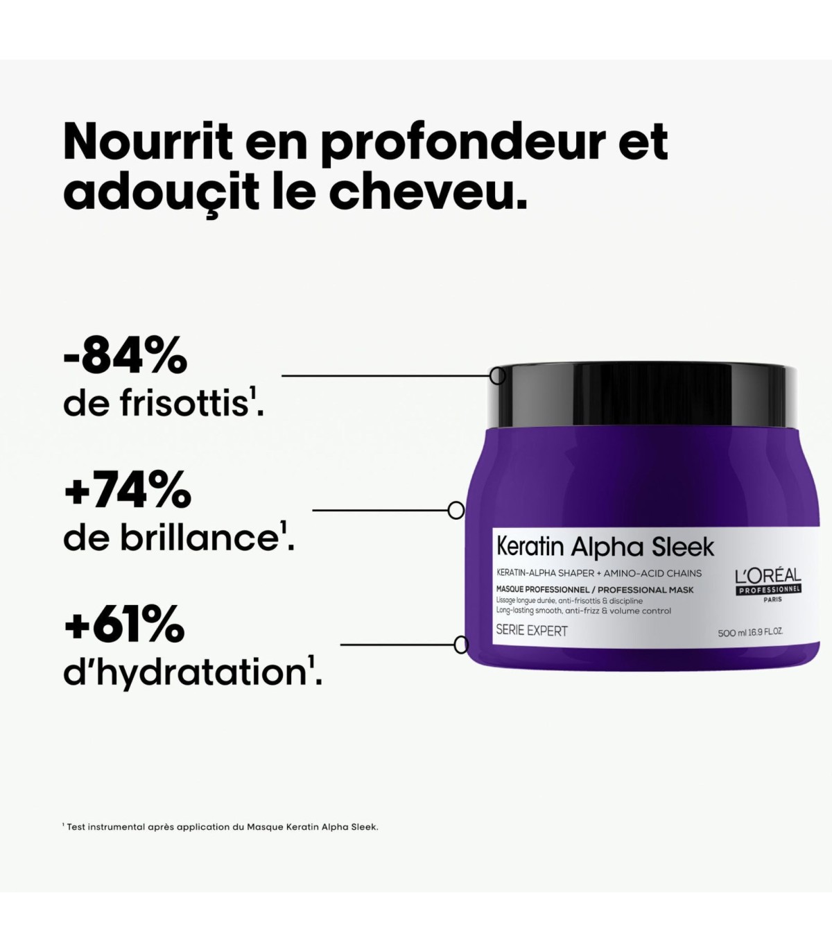 Utilisé dans la routine complète Keratin Alpha Sleek, il permet jusqu’à 2 semaines d’anti‑frisottis et un coiffage 3x plus rapide. Parfum sophistiqué aux notes fruitées, florales et boisées.