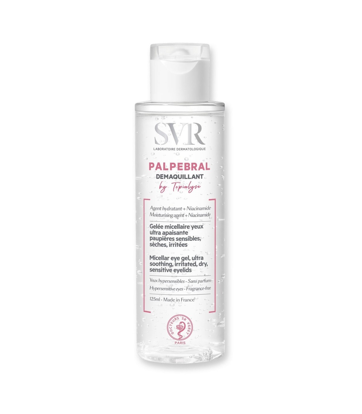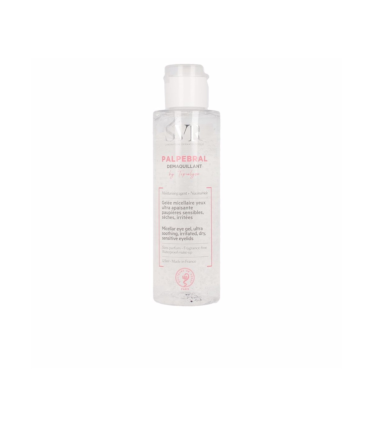 Palpébral démaquillant 125 mlTOPIALYSE Palpébral Démaquillant de SVR est spécialement formulé pour démaquiller en douceur les paupières et les yeux sensibles, sujets aux irritations. Ce soin nettoyant apaisant élimine le maquillage (même waterproof) sans frottements et sans agresser la peau délicate du contour des yeux. Enrichi en actifs hydratants et anti-irritants, il soulage les sensations de tiraillement et protège la barrière cutanée.