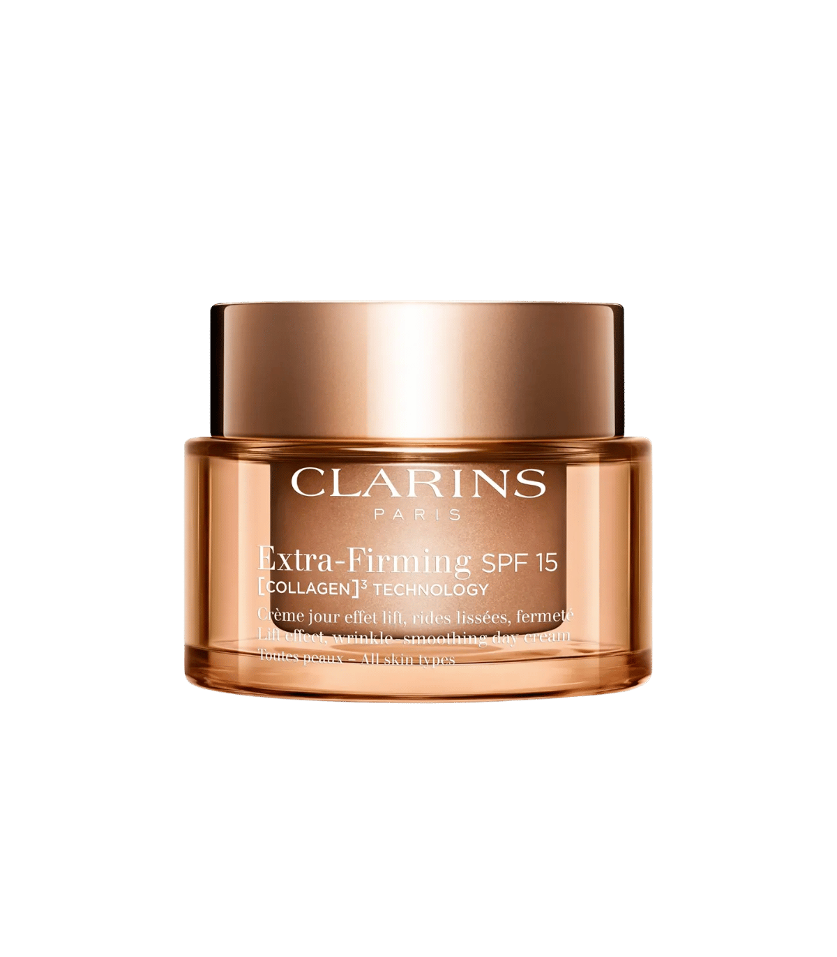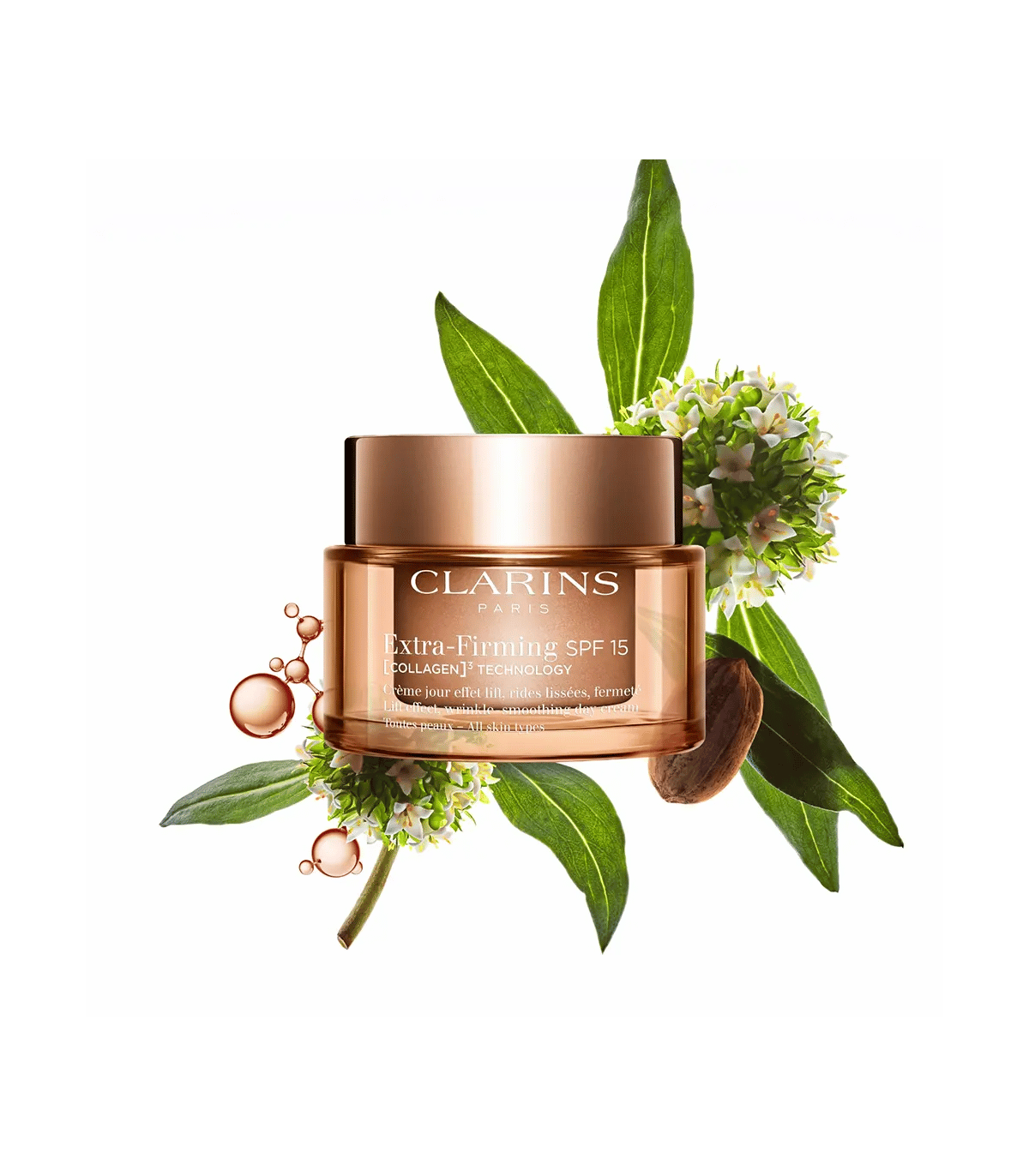 La Crème de Jour Raffermissante de Clarins est une innovation de pointe qui associe une TECHNOLOGIE exclusive [COLLAGEN] à trois puissants actifs pro-collagène :