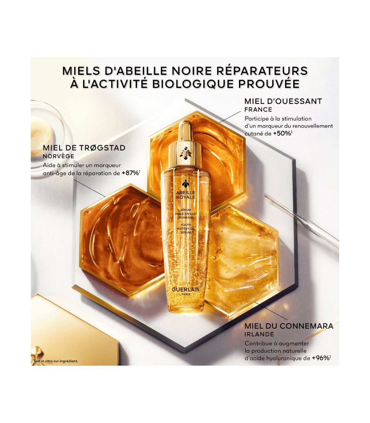 - Miels d’Abeille Noire : Enrichi de trois types de miels d’abeille noire, une espèce rare reconnue pour la puissance de ses miels, ce sérum active les mécanismes naturels de réparation de la peau.